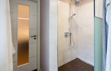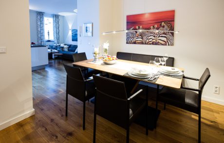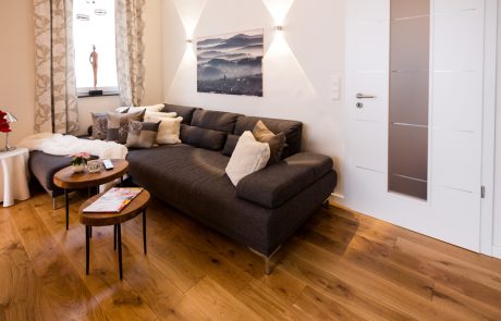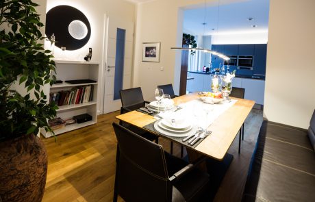 The apartment “Daheim” was recently completely refurbished. It is currently the third largest of the 4 apartments, with a living space of about 70 square meters and is divided into a bedroom, a large living-dining room with integrated luxury open kitchen, a shower-bath, a guest toilet and a hallway with cloakroom. It is located on the ground floor of the house. Through the oversized sliding glass door to the terrace / garden, the living area is flooded with light. This apartment is the most luxurious in the house and offers in addition to a high quality real wood parquet oak, a luxury kitchen, designer furniture and antiques, a private terrace with garden, ground floor access, and a large walk-in shower. The shower room also has additional underfloor heating.