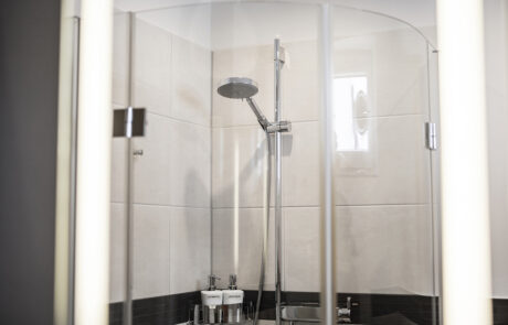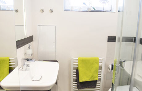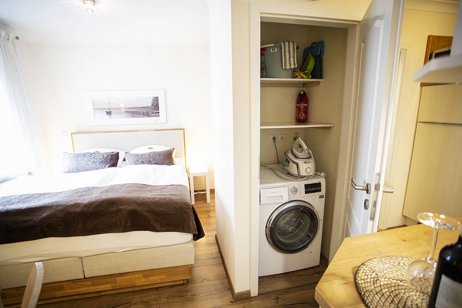 Detail hochwertig ausgestattet. Die Bodenbeläge sind aus Qualitätslaminat und Feinsteinzeug.
