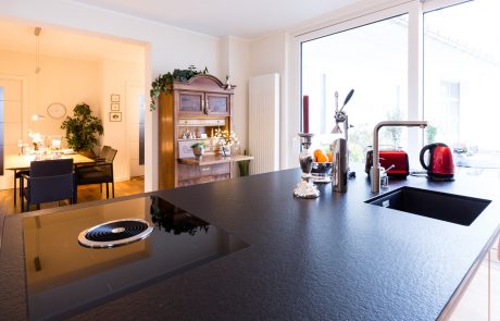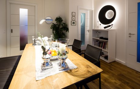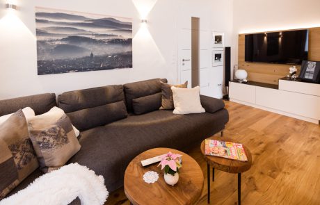 Het appartement “Daheim” werd onlangs volledig gerenoveerd en voltooid. Het is momenteel de derde grootste van de 4 appartementen, met een woonoppervlak van ongeveer 70 vierkante meter en is verdeeld in een slaapkamer, een grote woon-eetkamer met geïntegreerde luxe open keuken, een douche-bad, een gastentoilet en een hal met garderobe , Het bevindt zich op de begane grond van het huis. Door de extra grote schuifpui naar het terras / tuin, wordt de woonkamer overspoeld met licht. Dit appartement is het meest luxueuze in het huis en biedt naast een hoge kwaliteit echt houten parket eiken, een luxe keuken, designmeubels en antiek als het enige appartement een privéterras met tuin, toegang tot de begane grond en een grote inloopdouche. De doucheruimte heeft ook extra vloerverwarming.